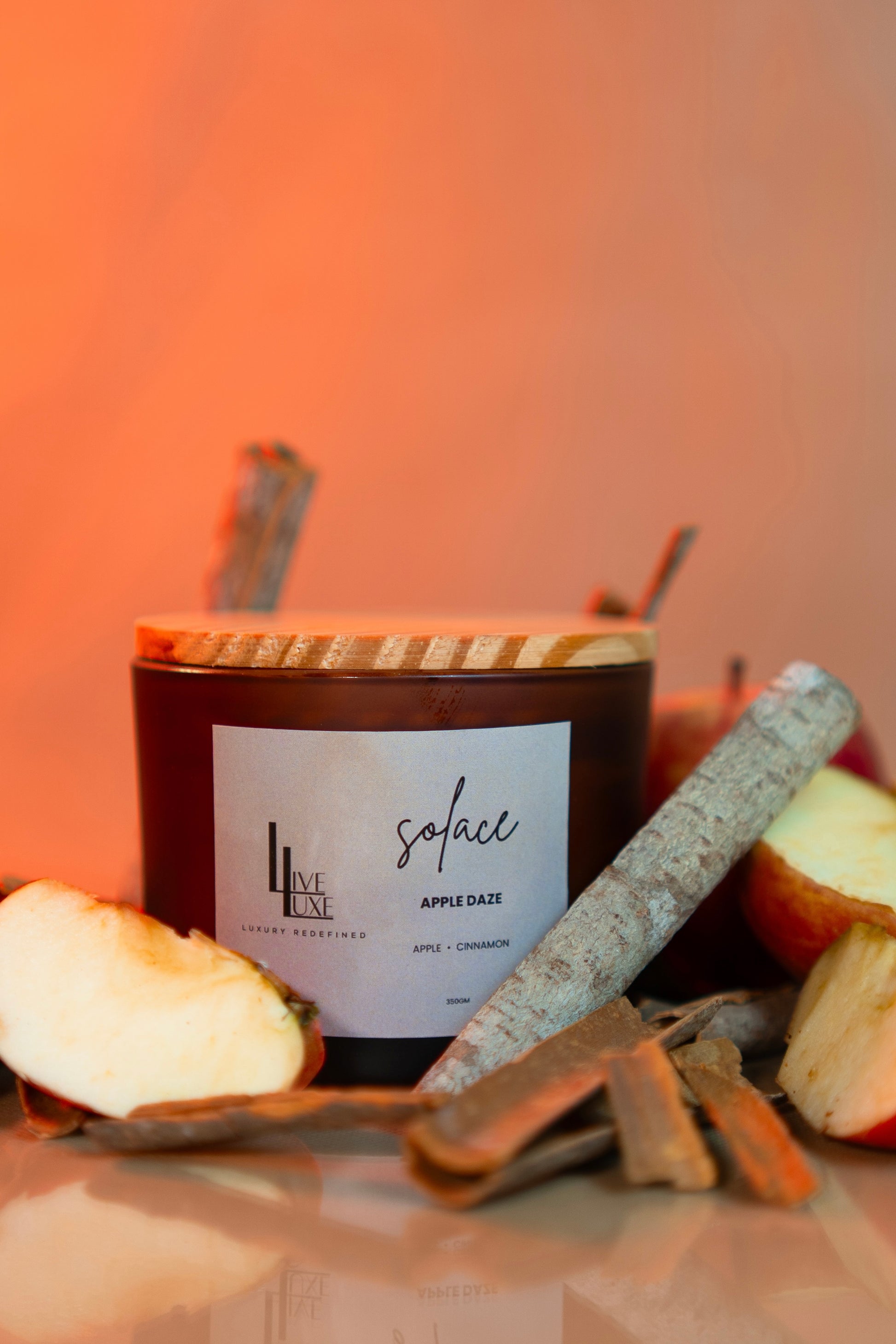 Bold, warm, and irresistibly inviting—Apple Daze from our Solace Collection is crafted for those who appreciate timeless comfort with a rugged edge. The crisp freshness of ripe apples meets the bold warmth of cinnamon, creating a rich and grounding ambiance that feels both energizing and cozy.